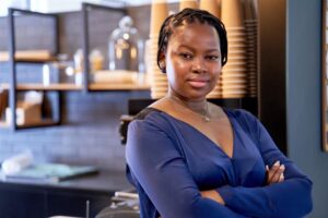 jovem negra, de blusa de manga longa azul marinho, de braços cruzados.